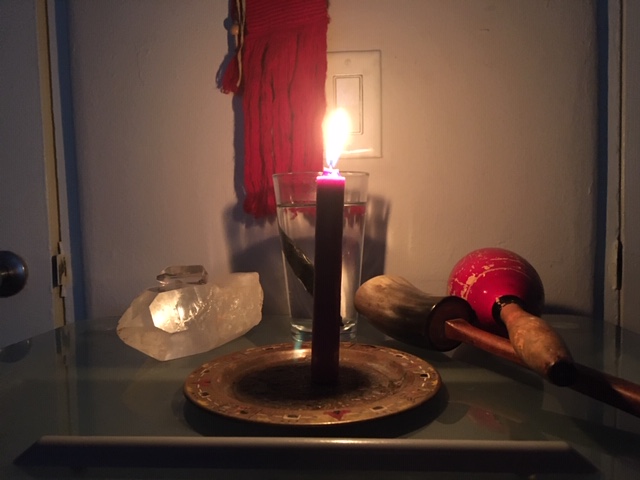 Today we keep the rattles on one single rhythm to let Spirit know we’re serious, through all the songs. Also, in a manner of speaking the altar has asked for a couple of crystals (as pictured). The speakers reverse order today and we stretch out our songs and dedications a bit.